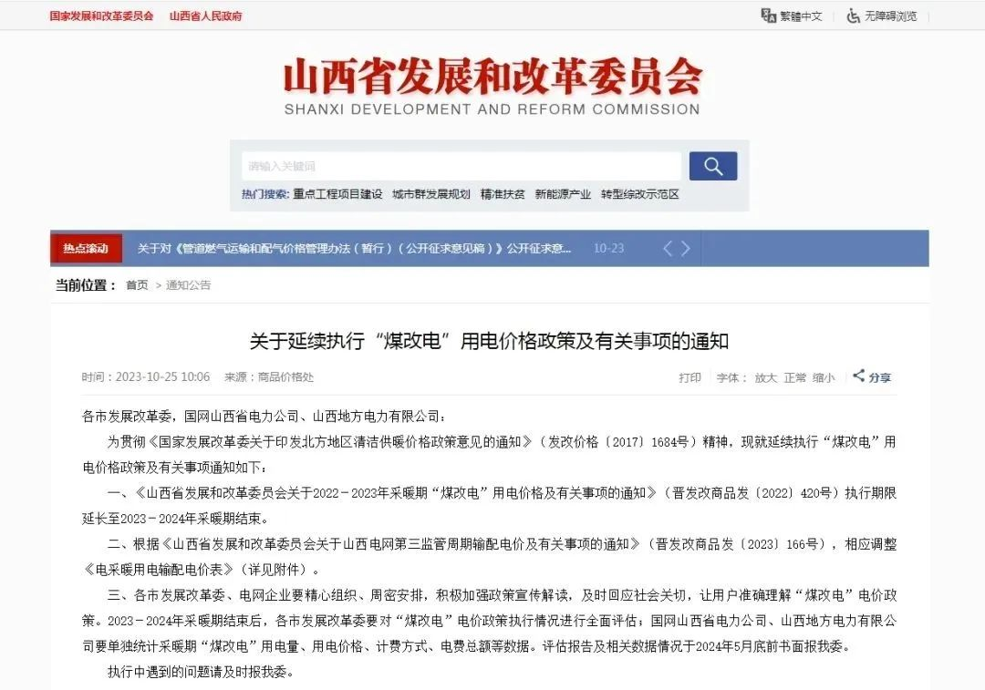 山西省:山西省发展和改革委员会发布《关于延续执行“煤改电”用电价格政策及有关事项的通知》,该通知指出今冬继续享用政府用电价优惠,谷电0.2862元/度。